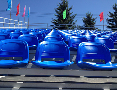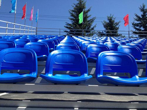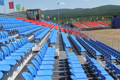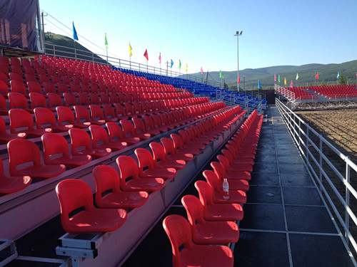 該看臺應用于阿爾山國際馬術表演場地。看臺三面圍繞賽馬場地,總共2000位,看臺整體起高1.2米,視野開闊,方便觀眾觀看。看臺橫拉斜拉布滿,結構穩固,每層都安裝側檔板,保證安全可靠。看臺座椅采用紅藍搭配,顏色醒目,與草原的藍天白云配在一起。整體美觀大方。
