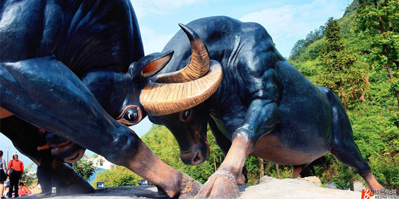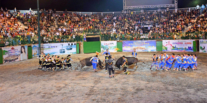 地處安化縣馬路鎮云臺山風景區的全國首家斗牛演藝廣場卻一如白晝,吶喊聲、喝彩聲不絕于耳。一場集斗牛、雜技、歌舞于一體的視覺盛宴在此如期舉行,1萬多名觀眾齊聚共同欣賞。