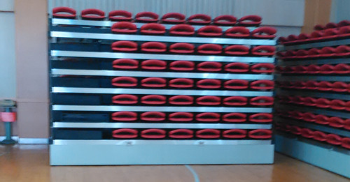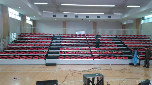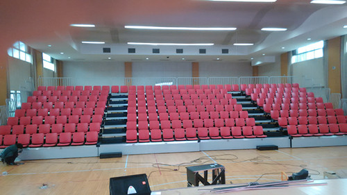 學校體育館常舉辦活動,觀眾看臺基本采用普通椅子,在校方領導指示下,經商議采用綠蛙公司可移動伸縮看臺,用時展開,不用時收在墻角。