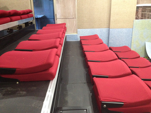南昌市東湖區淵明北路公安消防大隊,多功能廳改造,看臺采用可伸縮看臺,亮點在于配置高級軟包椅,喜慶的紅色,靠背特有的曲度設計,坐上去有種被愛包圍的感覺。