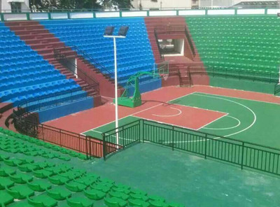 海南五指山體育場(chǎng)看臺(tái)看臺(tái)座椅完美收工。該籃球場(chǎng)看臺(tái)采用低靠背座椅,四周看臺(tái)基礎(chǔ)為水泥臺(tái)階,刷彩色油漆,間籃球場(chǎng)地采用硅PU,三者顏色互相呼應(yīng),整體美觀大方。乃戶外籃球場(chǎng)地上乘之作!