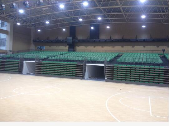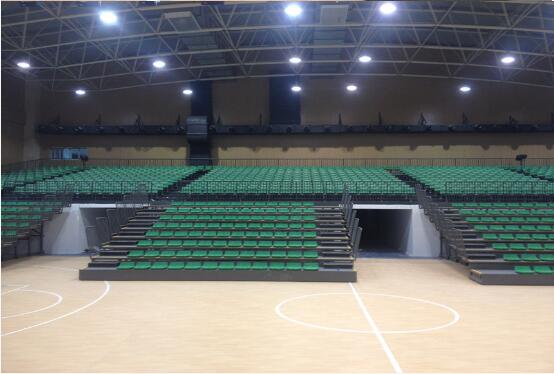 ?郴州柿竹園礦山體育館看臺為近來要求比較特殊的項目,本次項目分為固定看臺和伸縮看臺。固定看臺舍棄了水泥臺階的做法,直接采用鋼結構搭建,前段再接伸縮看臺。綠蛙看臺在項目前期與業主方進行了大量的全方位的溝通,最后設計出了該看臺方案。經過幾個月的施工與安裝,最終呈現在我們面前的看臺非常美觀,非常有氣勢。