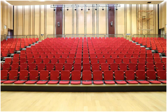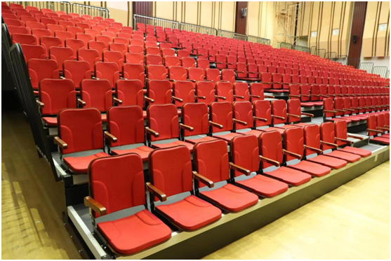 綠蛙看臺(tái)為學(xué)術(shù)交流中心配置了前置式包綿軟包座椅帶扶手的電動(dòng)伸縮看臺(tái),為滿(mǎn)足客戶(hù)特殊需求,在座椅背面還增加了網(wǎng)兜設(shè)計(jì)。配合交流中心莊嚴(yán)的設(shè)計(jì),大氣整潔的看臺(tái)為這個(gè)“舞臺(tái)”增添了又一種色彩。