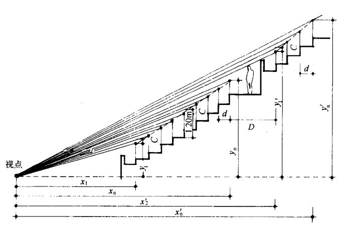 我們認為在 C值中可以不考慮h3的因素,除了上述原因外,還因為大型運動場的大部分座位是不對號坐的,一般人一定不會坐在比自己高得多的人后面。而將自由選擇合適的座位坐在與自己身材高矮差不多的人后面。而且當前面觀眾坐的姿式變動時。自己也可以相應的變動姿式,來滿足視線要求。