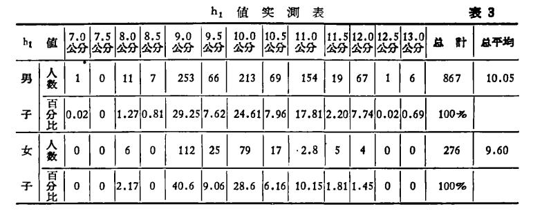 h1值是決定C值的重要組成部分,目前一般都認為是12公分。這些數字都是從國外資料中得來的,為了求得我國人體的h1值,對1143名人員進行了實測,其對象選擇為青少年和成年人,實測記錄見表3: