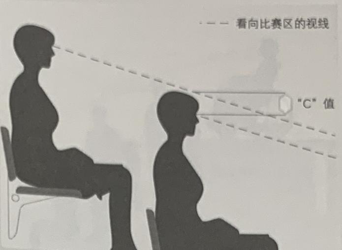 視線一詞指的一個觀眾越過下面觀眾頭頂看到比賽場地的一個關鍵點的能力,它是通過“C”來測量的,如下圖。