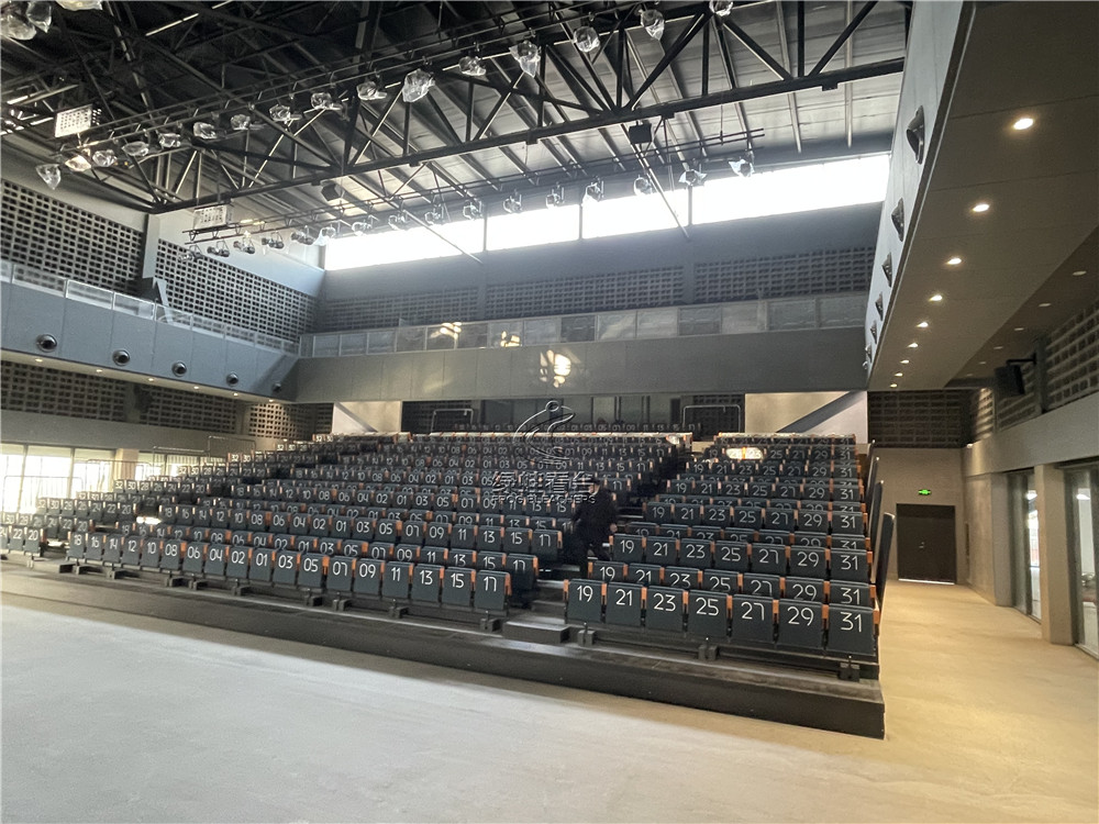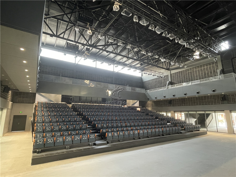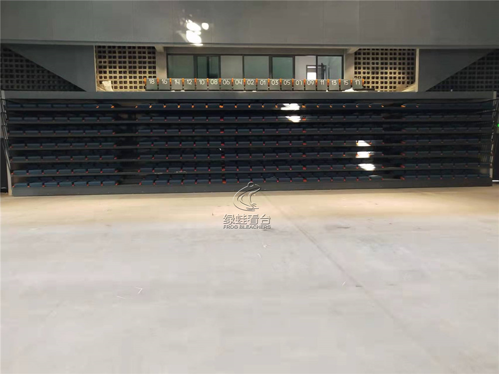 綠蛙看臺承接了鄭州彩虹盒子藝術園的室內電動看臺座椅安裝調試項目,采用了一層雙排后置式軟包電動伸縮看臺,共448位(踏步20級),最大化的利用空間面積,同時兼顧觀眾的使用體驗及安全性能。