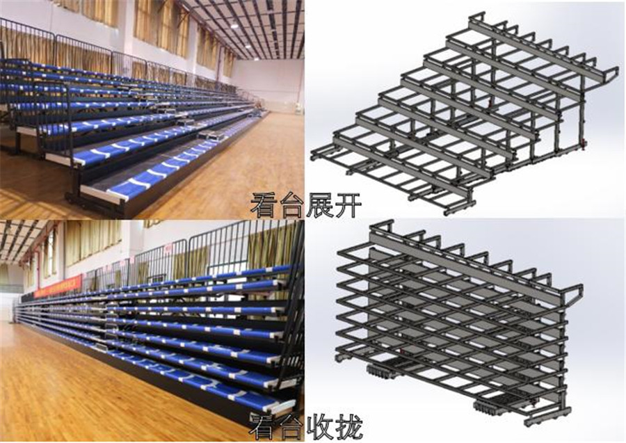 活動看臺,又稱為伸縮式看臺,看臺由座椅、踏板、步梯豎板和可伸縮的底部支架組成。同時,該系統具有多種不同的行距和臺階高度,以滿足空間和觀眾視線的要求。其伸縮方式分為手動、半自動和電動三種操作方式,因其靈活性使其具有多種不同的收合方式,墻貼式、獨立式、移動式、壁納式和倒轉式。