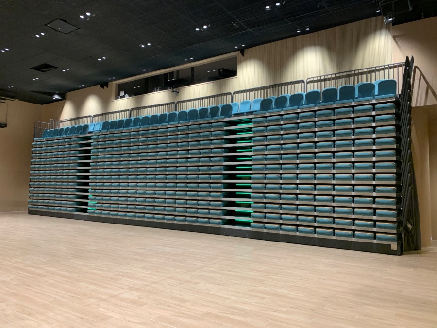 看臺(tái)總共是13排,可容納觀眾394人。上面配置有兩條通道。通道上面的踏步上裝有燈帶,方便在光線昏暗的情況下觀眾的出入。看臺(tái)收攏后的深度只有1.5米,整體像一面墻一樣壯觀。看臺(tái)收攏后騰出了巨大的空間,可以做其他的功能使用,大大增加了場(chǎng)地的使用效率。