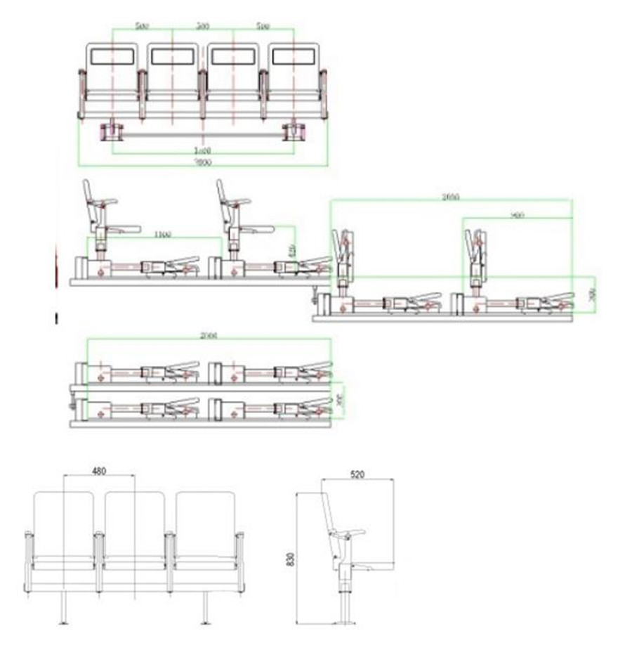 2、 座椅外形尺寸:480W×520D×830H。允許正負10mm的偏離。座椅安裝間距480mm。