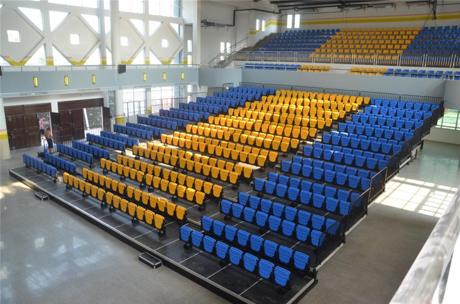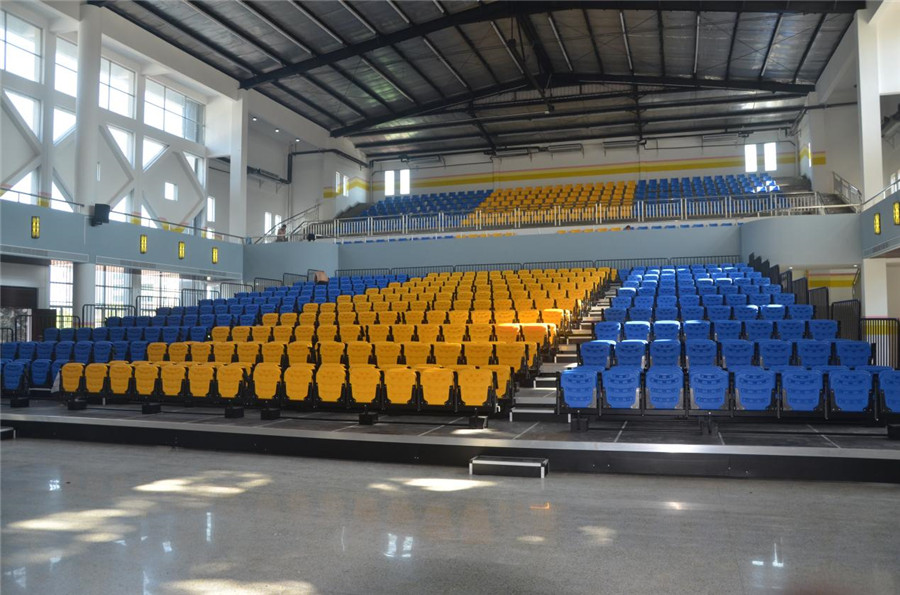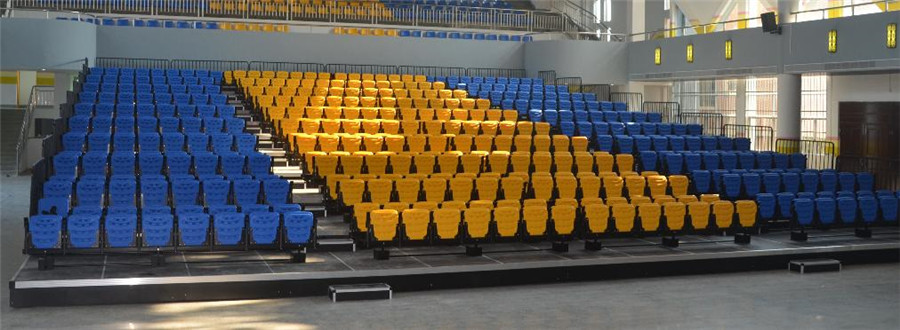 1、 座椅安裝:活動看臺座椅采用高靠背翻板折疊吹塑座椅,后置式安裝,座椅通過專用工具手工整排翻動,翻動過程靈活、輕巧。