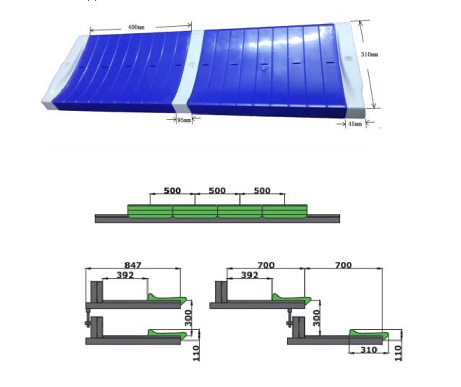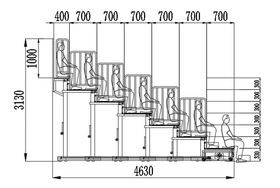 (2)看臺整體為垂直支撐結(jié)構(gòu)。看臺層寬700mm,尾層寬400mm;首層高330mm,其他層高300mm。(伸縮看臺為定制產(chǎn)品,可根據(jù)實(shí)際場地和客戶需求,略微調(diào)整尺寸。)