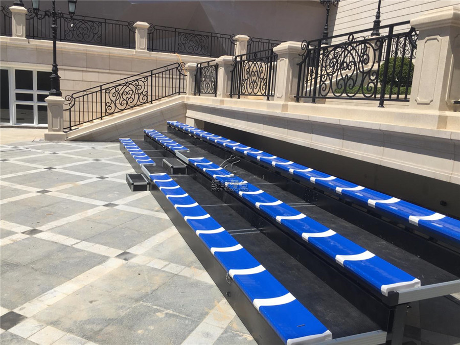活動看臺座椅采用平靠背注塑座椅,前置式安裝。座椅兩端各有一個(gè)安裝孔,透過座椅安裝孔將座椅直接安裝在看臺的踏板上,不需要任何金屬連接片。