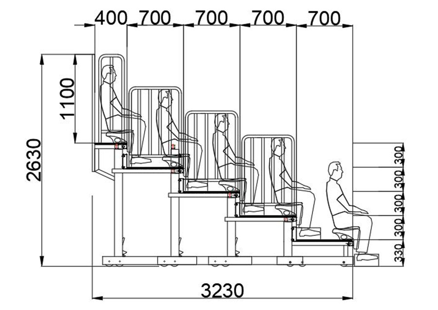 (2)看臺整體為垂直支撐結構。看臺層寬700mm,尾層寬400mm;首層高330mm,其他層高300mm。(伸縮看臺為定制產品,可根據實際場地和客戶需求,略微調整尺寸。)