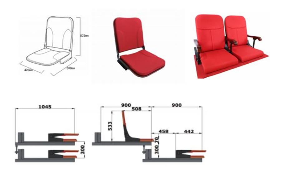3)座椅尺寸:活動看臺座椅采用高靠背包棉翻板折疊座椅,前置式安裝。座椅背高533mm,座深508mm,座寬420mm。允許±10mm偏離。以下為伸縮看臺座椅尺寸示意圖。請提交樣品。