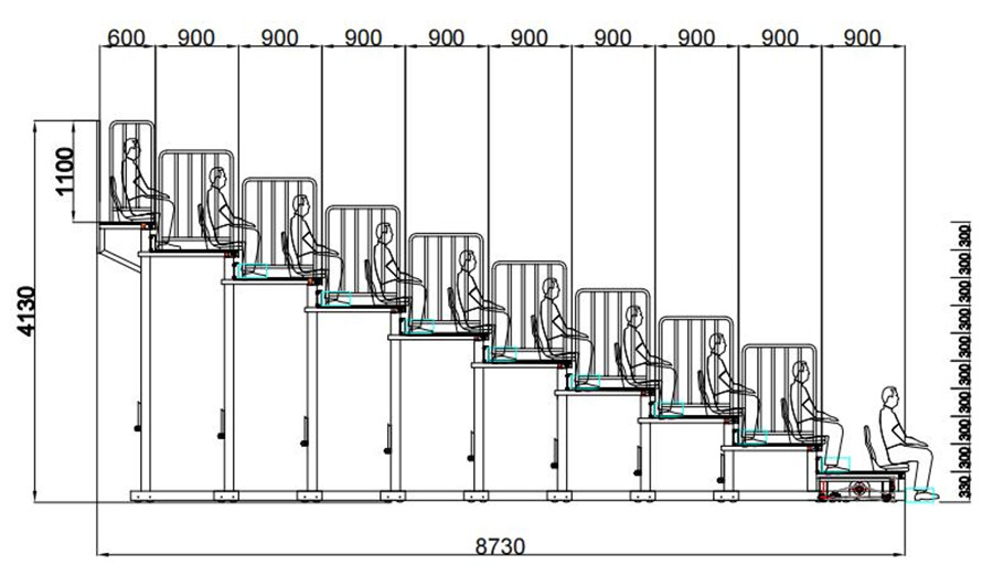 (2)看臺整體為垂直支撐結構。看臺層寬900mm,尾層寬600mm;首層高330mm,其他層高300mm。(伸縮看臺為定制產品,可根據實際場地和客戶需求,略微調整尺寸。)