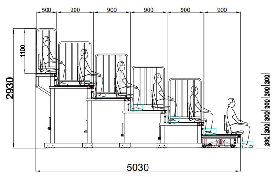 (2)看臺整體為垂直支撐結(jié)構(gòu)。看臺層寬900mm,尾層寬500mm;首層高330mm,其他層高300mm。(伸縮看臺為定制產(chǎn)品,可根據(jù)實(shí)際場地和客戶需求,略微調(diào)整尺寸。)