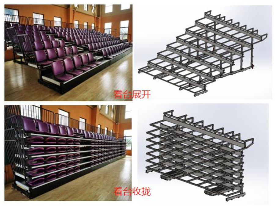 伸縮看臺也稱為活動看臺,活動看臺的稱呼是相對于固定看臺而來,伸縮看臺拉伸成臺階形時,看臺上的座椅供觀眾舒適地欣賞節(jié)目,收縮成匣子狀(似抽屜)時則占用很少的空間,讓出場地以安排他用。伸縮看臺可充分利用室內(nèi)的有限面積,滿足不同功能情況下的多座位要求。伸縮看臺廣泛應(yīng)用于體育館、會議室、示教室、演播廳、多功能廳等。