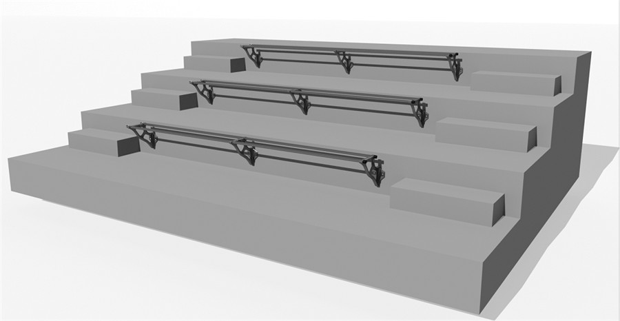 1)量出需要安裝座椅的區段的尺寸,一般是指固定看臺踏步通道與踏步通道之間的區間,然后對照設計圖紙,看需要多少個支架腿,分布好(FrogSport)。